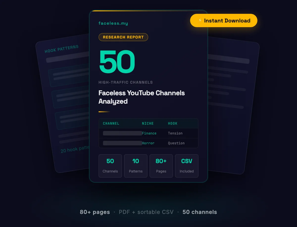 Upload cadence, script structures, thumbnail patterns, title formulas. All 50 channels dissected in one 80-page report with a companion spreadsheet. No fluff. No theory. Just what works.