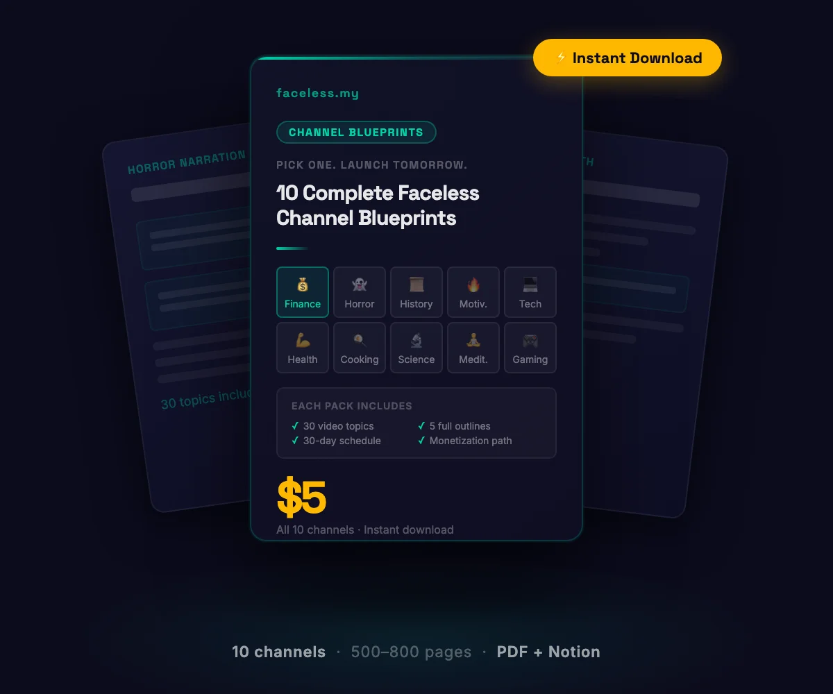 This is one of the 10 packs. Each niche is built to the same depth. Finance has the densest monetization research. Horror has the simplest production workflow. Cooking requires the least scripting.